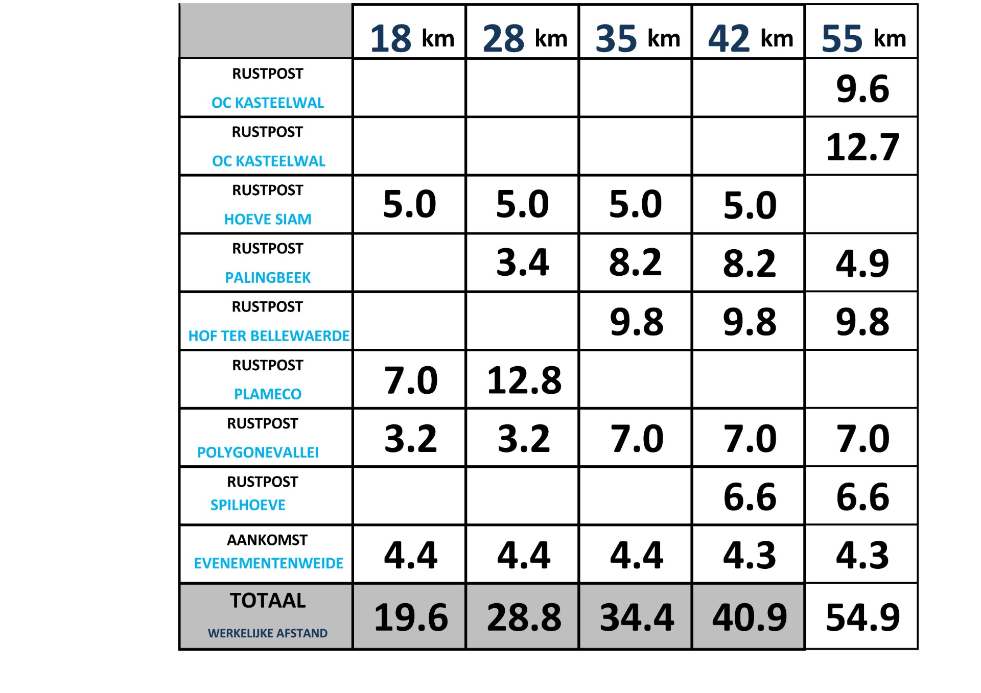 De openings- en afsluitingstijden van de posten zijn gebaseerd op een min van 4.2 km/u en max 7.0 km/u. Lopen en snelwandelen is toegestaan, hou echter rekening met de openings- en sluitingstijden van de diverse rust- en bevoorradingszones.