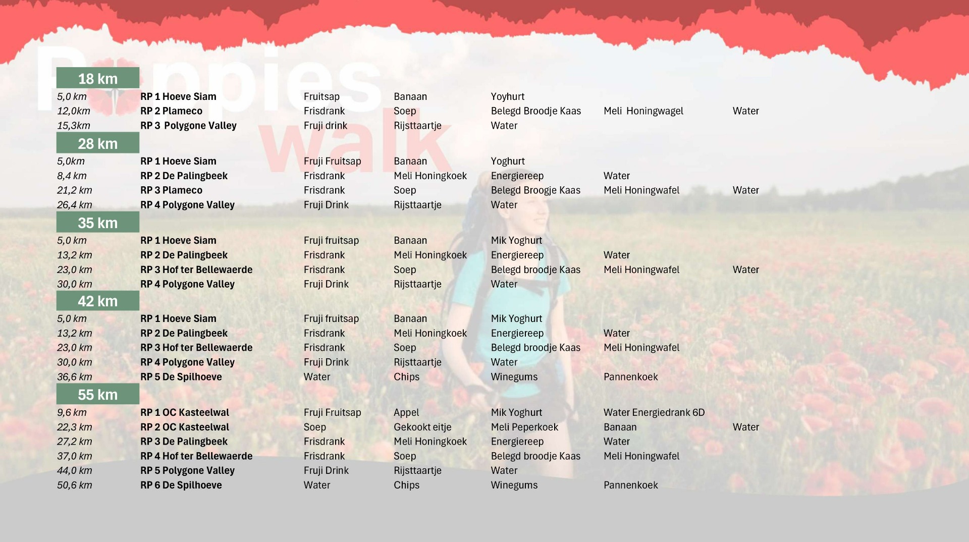 In het deelnamepakket is een ruime bevoorrading inbegrepen. We zorgen voor een diversiteit aan producten, zoals fruit, koeken, energiereep, belegde broodjes, soep, water, suikerhoudende dranken, honingwafel en voor elke finisher een fris Lupulus biertje.